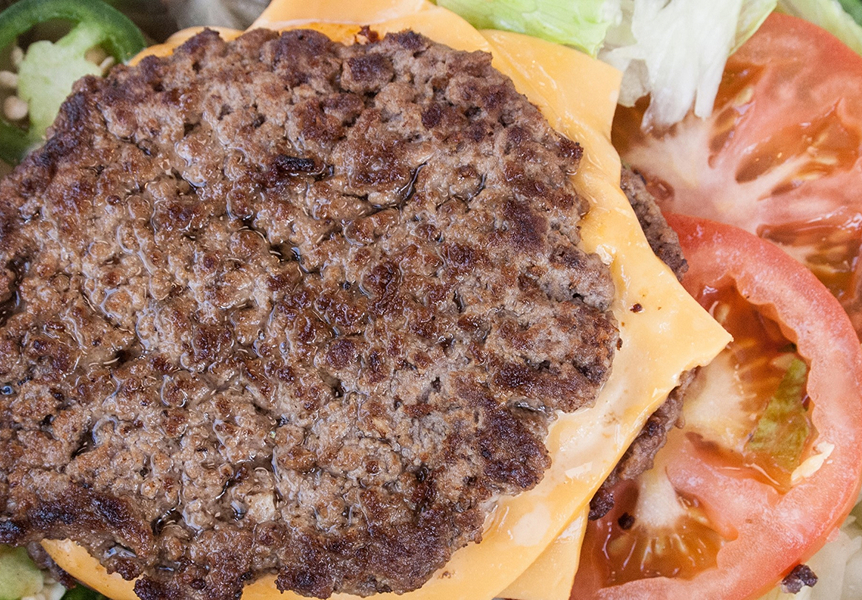 A burger patty in between slices of American-style cheese melted on an inside-out sesame seed bun and grilled until golden brown. Add as many toppings as you’d like.