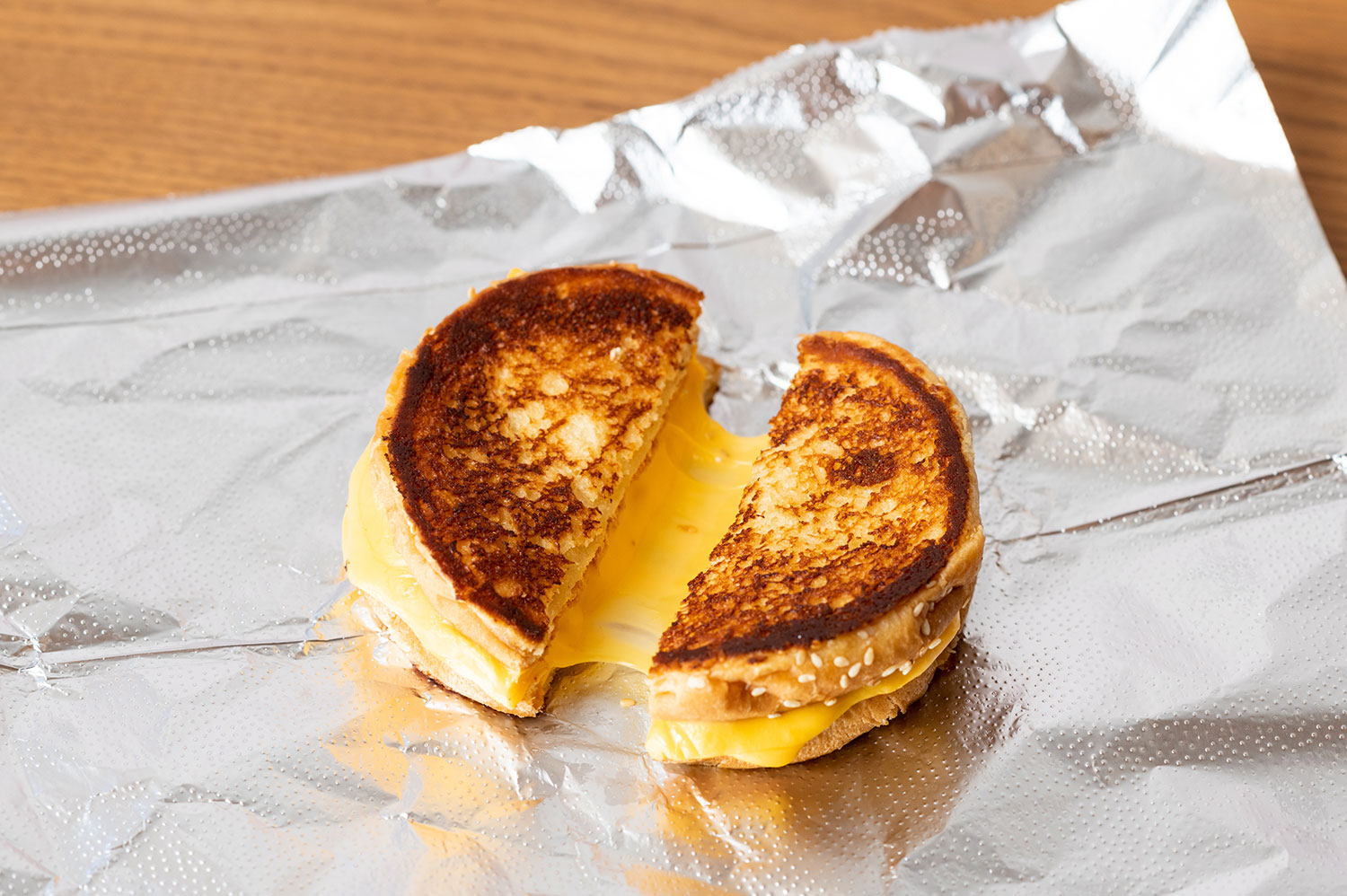 Slices of American-style cheese melted on an inside-out sesame seed bun with toppings of your choice and grilled until golden brown.