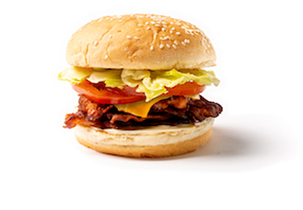 Melty cheese, strips of crispy Applewood smoked bacon, fresh tomato slices, mayo and hand-shredded lettuce on a soft, toasted sesame seed bun.